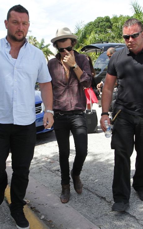 The guys from One Direction will use stay in Miami to film a new video. On location shooting Thursday Harry Styles is here, surrounded by bodyguards who were trying to hide from the paparazzi. 1D singer looked great as always, in a brown shirt, black tight jeans with a hat on his head. By the way, Harry has recently added another tattoo to his collection. In fact, it is the ankles to the legs tattooed the words "Never gonna days again," a line from a popular song by George Michael, "Careless Whisper".